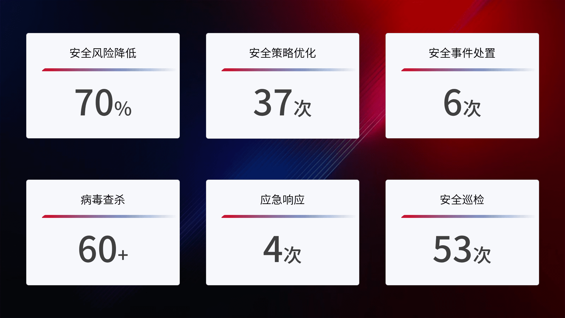 提供全面的安全事件报告体系,,,包括处置报告、、、周报、、、、季度和年度总结,,,结合持续监控,,,,帮助客户深入了解网络安全状况。。。。